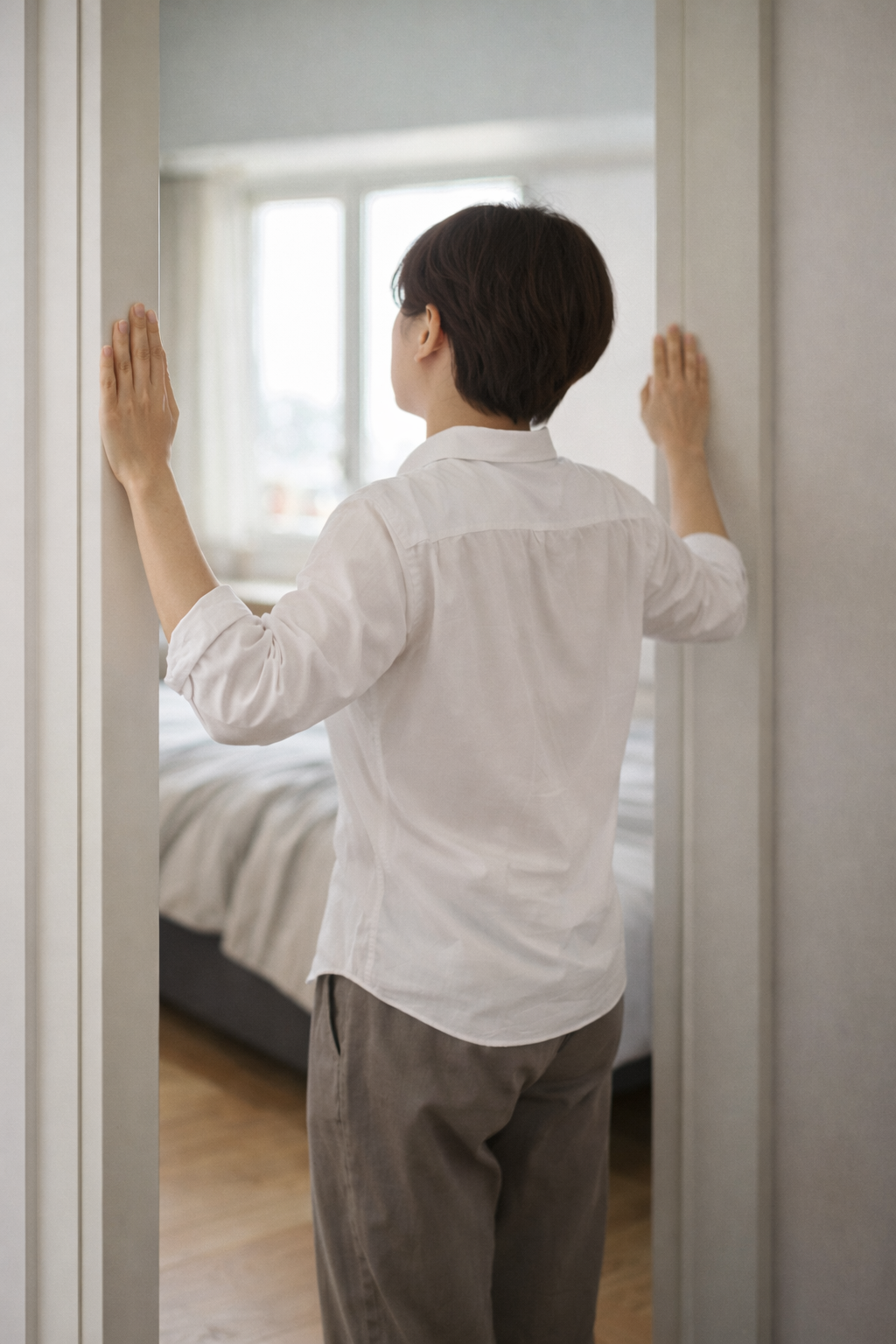 어깨를 으쓱 올리는 방향이 아니라, 아래로 내리고 뒤쪽으로 살짝 모읍니다.